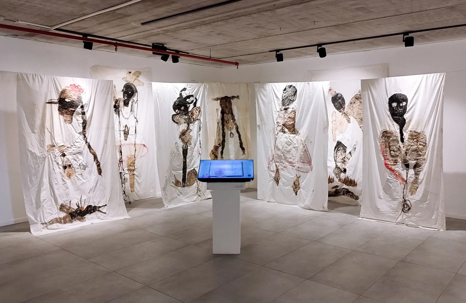 Like an audience, large-scale androgynous figures stand on hanging paintings. It is unclear whether they are wounded or animalistic. They bear witness to the act of chanting. The fragility of the figures in the paintings represents the female body’s power in the face of tradition, underlining the trajectory from vulnerability to resolve. Through painting, drawing, video, and sound, Helbitz Cohen blurs the boundaries between sacred and profane, between trivial, quotidian material and ancient, canonical text. She rebuilds a female ceremonial space. This is a space where the biblical story becomes a tool for writing about love and pain, parting ways and continuity, where the female body and voice are newly etched in history.